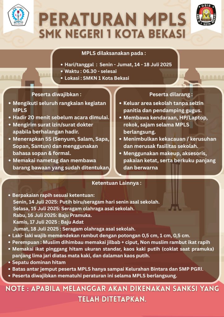 1. Nametag 2. Perlengkapan Shalat 3. Kitab Suci 4. Obat-obatan Pribadi 5. Alat Tulis 6. Topi Asal Sekolah 7. Buku MPLS 8. Snack dan makan berat (kotak makan) 9. Air Mineral (Botol minum) min 1 liter 10. Kantong Plastik hitam (1 gugus 1 kantong) |